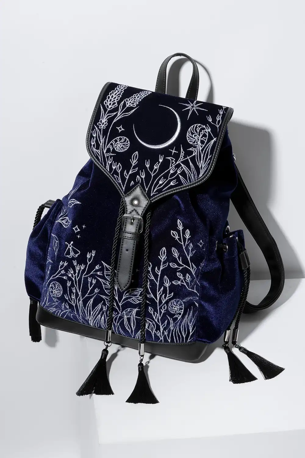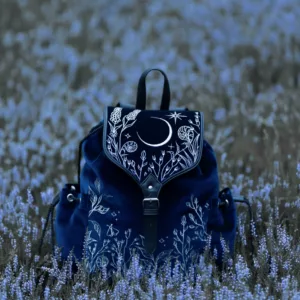 • Dunkelblauer Samt in „midnight blue“ mit silberner himmlischer Stickerei