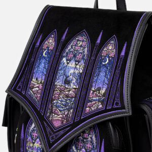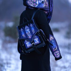 • Aufwendige Nordlichter-Stickereien mit gotischen Bogenfenstern und Türmen auf der Klappe, den Seitentaschen und der Vordertasche
