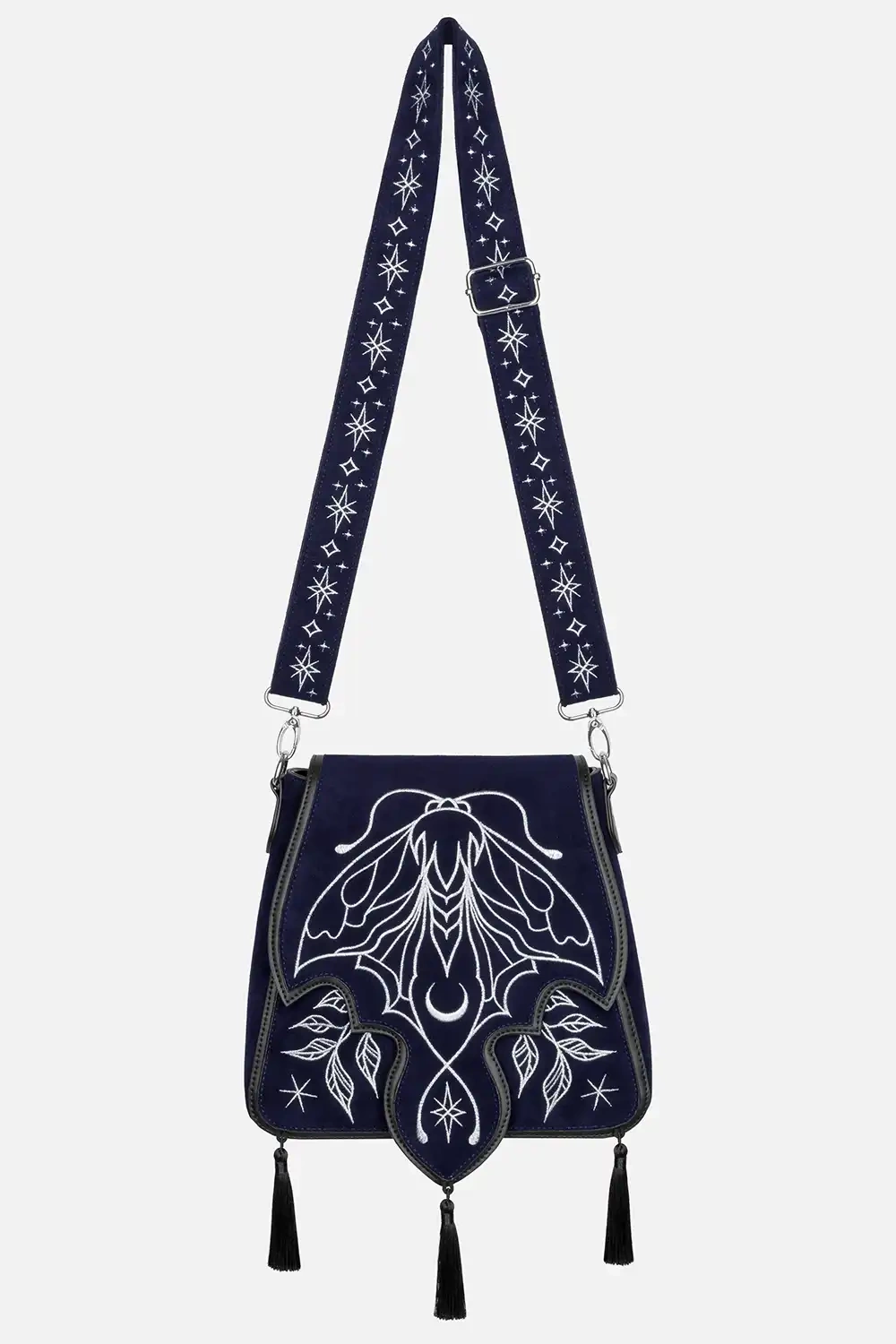 • Dunkelblaues Kunstwildleder im Farbton „midnight blue“ mit silberner Stickerei einer großen Luna-Motte, Sternen, Halbmond und botanischen Details